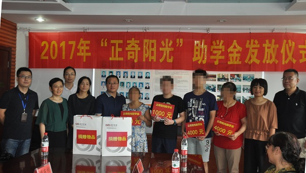 “正奇阳光”助学金于2014年8月设立,仅用于资助家庭经济特别困难且品学兼优的中小学生、本科生。今年是“正奇阳光”助学金资助贫困学子的第四年,三孝口街道杏花社区的两名孩子在“正奇阳光”助学金的资助下已经从小学升入初中。今年“正奇阳光”助学金首次对三孝口街道龚湾社区两个贫困家庭的大学新生进行了资助,这两名学生在今年的高考中分别以优异的成绩被陕西师范大学和南京航空航天大学录取。